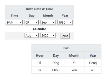 Without (or with an incorrect) your Bazi, trying to use the Bazi Calendar will be akin to trying to drink soup with a fork. Ensure you enter your date and time of birth and click "plot". You will notice the Bazi table updating to reflect your Bazi. Double check the auto calculated Bazi and adjust where necessary.
